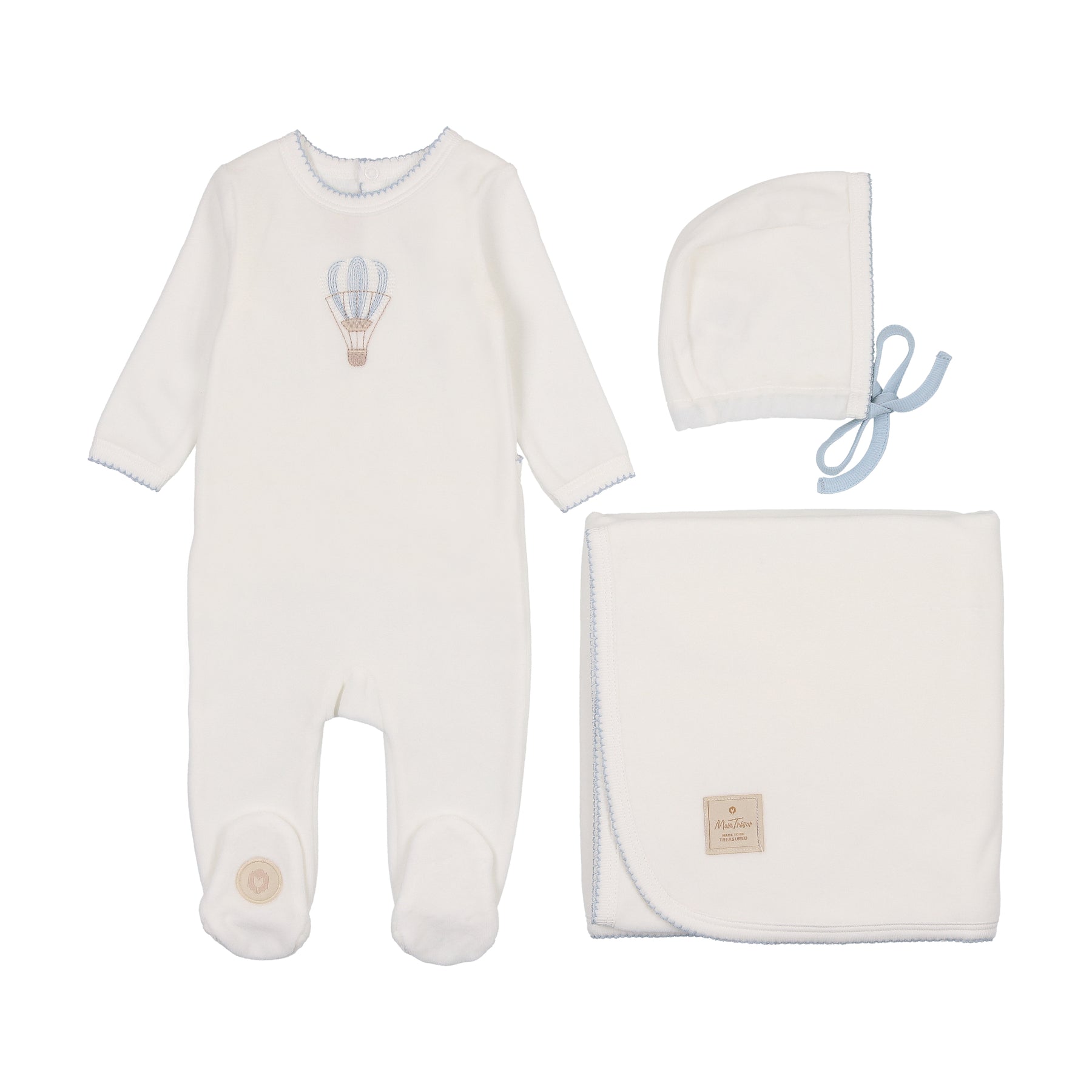 Mon tresor set footie embroidered balloon with bonnet and blanket - ivory