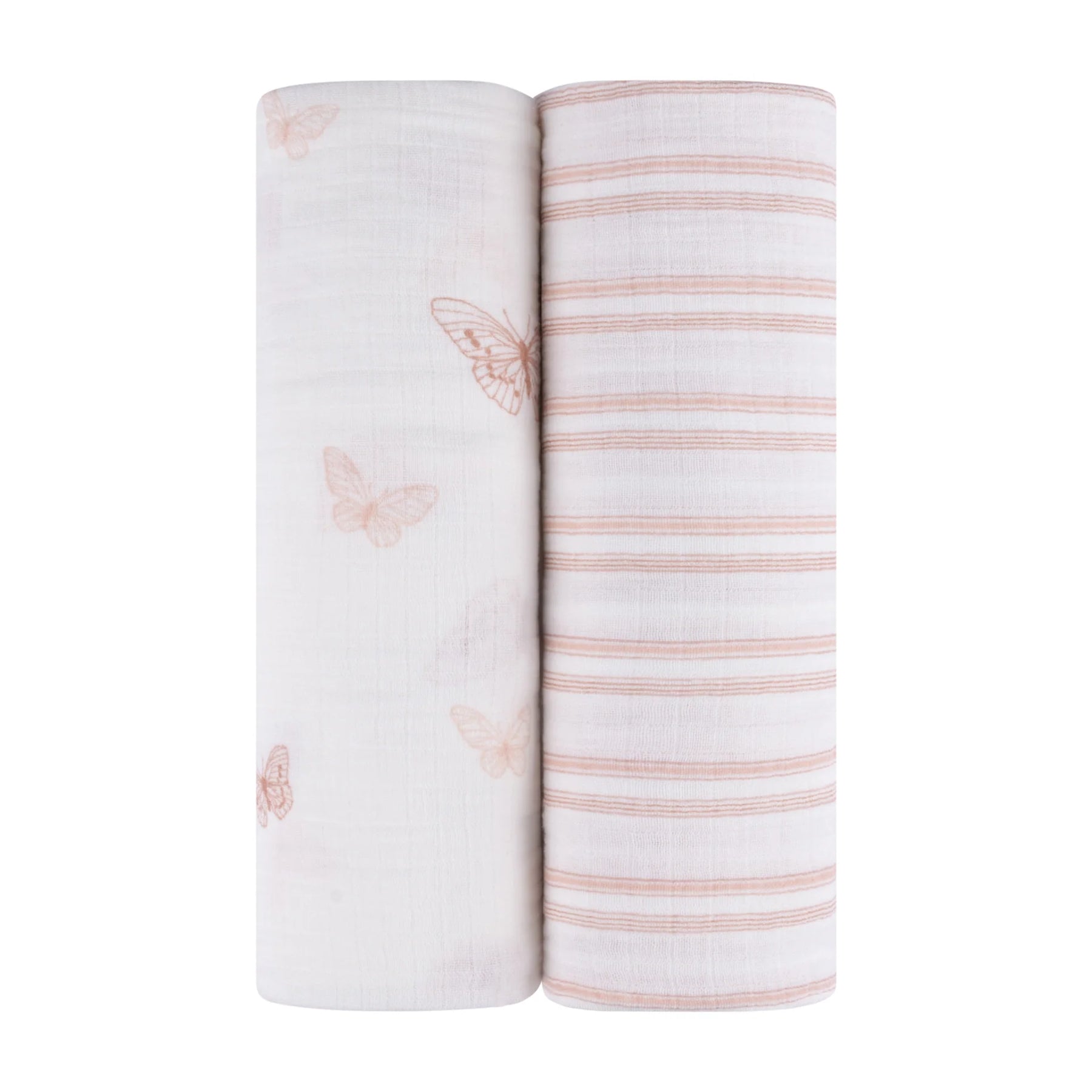 swaddle printed with striped muslin 2 pack - pink butterfly/strpd