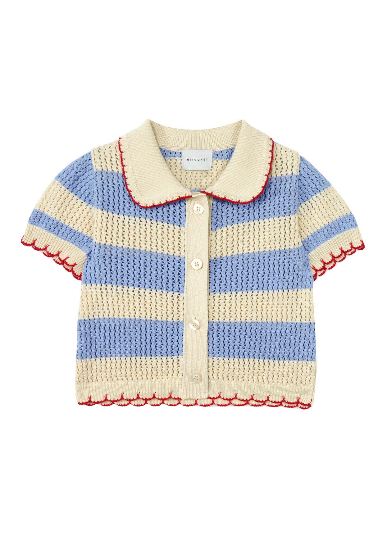 Mipounet top s/s striped knit cardigan with scalloped collar and trims - ecru/blue