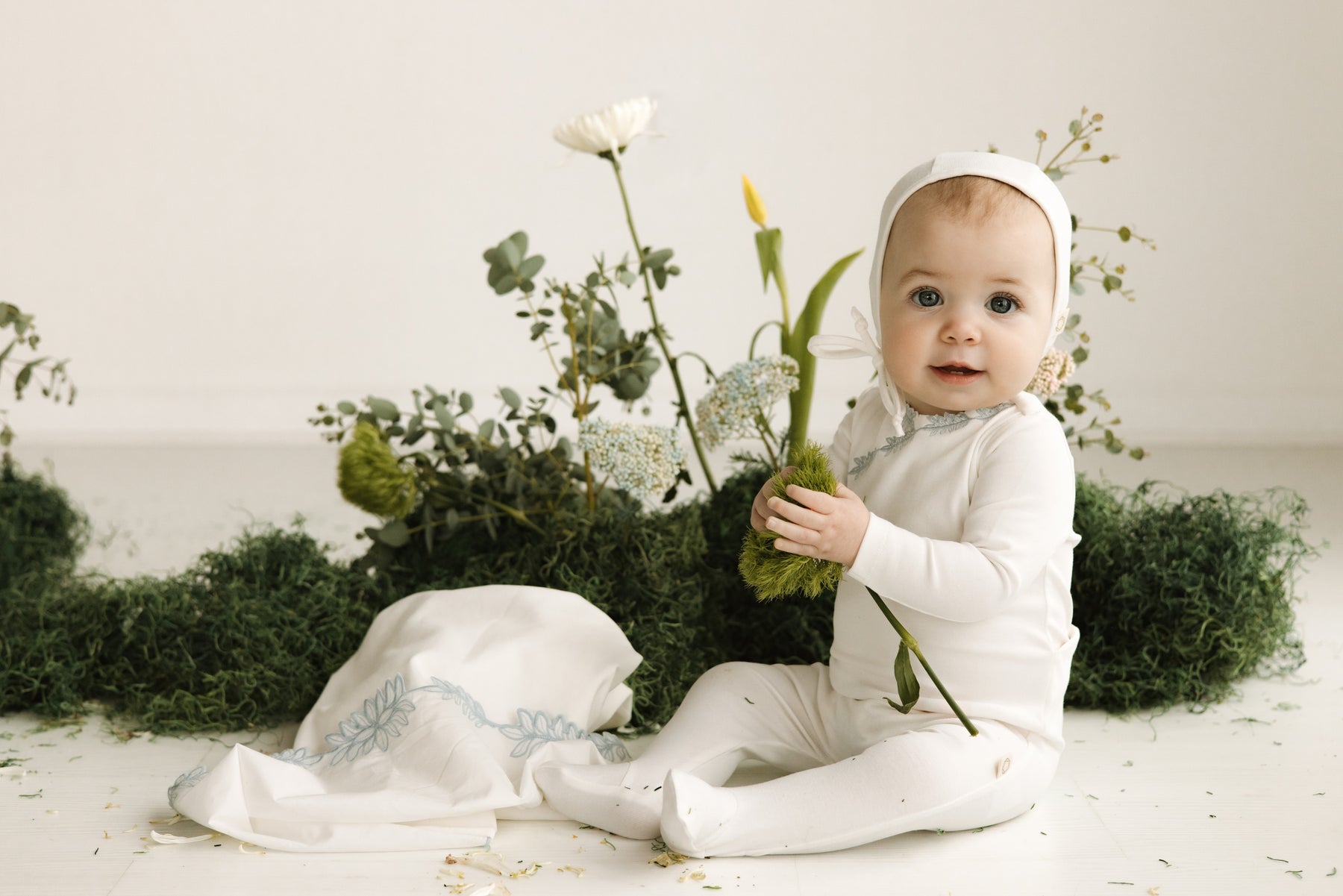 footie floral edge wrap with bonnet - white/blue